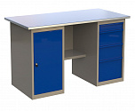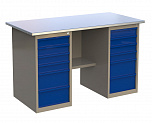 Верстак двухтумбовый поставляется в разобранном виде (4 элемента). Нагрузка на столешницу до 600 кг. Стандартный цвет: корпус - серый глянец RAL 7030, ящики и двери тумб - синий RAL 5017. Размеры:855x1400x700 мм. Масса: 116 кг.