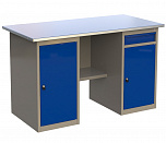 Верстак двухтумбовый поставляется в разобранном виде (4 элемента). Нагрузка на столешницу до 600 кг. Стандартный цвет: корпус - серый глянец RAL 7030, ящики и двери тумб - синий RAL 5017. Размеры: 855x1400x700 мм. Масса: 78 кг.