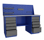 Двухтумбовый. Допустимая нагрузка на столешницу 1000 кг. Опорные элементы выполнены сварными из холоднокатаной стали. Для выполнения сборочных, ремонтных, слесарных, монтажных и других видов работ на производстве, в сервисных центрах, мастерских, гаражах, а также для обучения технологии в учебных заведениях. Комплектуется полкой-стенкой, расположенной под столешницей для удобного размещения габаритного инструмента и оснастки. Размеры верстака: 855x1596x696 мм. Вес: 105 кг. Поставляется в 4 комплектациях на выбор.