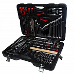 Набор инструментов в чемодане 1/4" & 1/2" 6-гранный 156 предметов. В наборе: головки 1/2", 1/4" (6РТ), головки глубокие 1/2", 1/4" (6РТ), головки TORX 1/2", 1/4", трещотка 1/2", 1/4", удлинитель 1/2", 1/4", кардан 1/2", 1/4", вороток-отвертка 1/4", держатель для бит 1/4", переходник 3/8", свечная головка 1/2" (6РТ и 12РТ), держатель для бит 5/16", вороток с шарниром 380 мм, вороток Г-образный 260 мм, биты 1/4", биты 5/16", ключи рожково-накидной: 6-24 мм, ключи разрезные, Г-образный ключ HEX, пассатижи 7", бокорезы 6", клещи с фиксатором 10", молоток 500 г, набор выколоток и зубил, отвертки с антискользящей рукояткой.