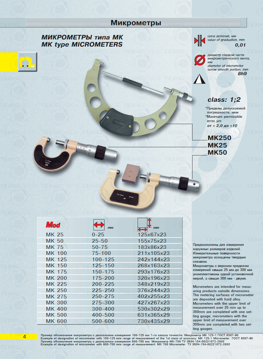 Цена деления 0,01 мм. Диапазон измерения от 250-275 мм. Для измерения наружных размеров изделий. Измерительные поверхности микрометра оснащены твердым сплавом. Микрометры укомплектованы одной установочной мерой. Класса точности 1. ГОСТ 6507-90. Поставляется в двух вариантах с поверкой и без поверки!