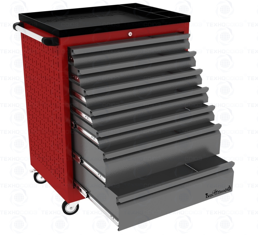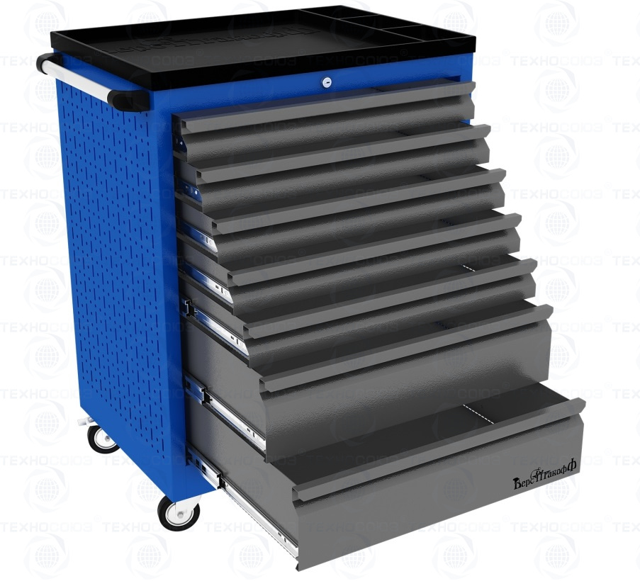 Тележки инструментальные серии PROFFI 950 предназначены для использования на предприятиях любого профиля занятых ремонтом и изготовлением различной продукции. На боковые стенки инструментальной тележки нанесена перфорация размером 25х25 мм и диаметром отверстия 8 мм, что позволяет устанавливать на них навесной инструмент или крючки. Наибольшей популярностью тележки инструментальные пользуются в сфере авторемонта и обслуживания автомобилей .Тележки имеют выдвижные ящики на шариковых телескопических направляющих полного выдвижения с фиксацией в закрытом положении, предотвращающее открывание при передвижении тележки. Ящики имеют центральный замок, который позволяет ограничить доступ посторонних лиц к содержимому ящиков. Тележка инструментальная изготовлена из высококачественного металла ведущих Российских производителей, покрашена порошковой краской производства Германии, имеет итальянскую и турецкую фурнитуру. Тележки для инструмента оснащены двумя не поворотными колесами диаметром 100 мм, одним поворотным и одним поворотным со стопором, которое фиксирует тележку и предотвращает непроизвольное скатывание.