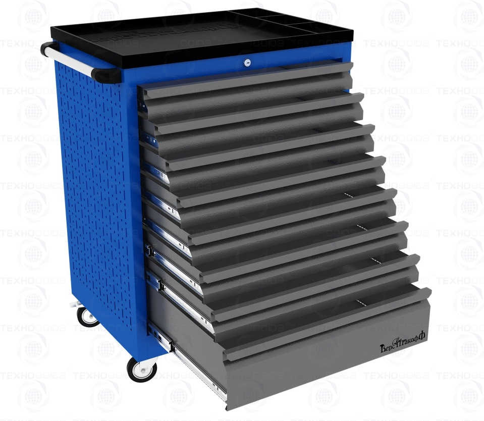 Тележки инструментальные серии PROFFI 950 предназначены для использования на предприятиях любого профиля занятых ремонтом и изготовлением различной продукции. На боковые стенки инструментальной тележки нанесена перфорация размером 25х25 мм и диаметром отверстия 8 мм, что позволяет устанавливать на них навесной инструмент или крючки. Наибольшей популярностью тележки инструментальные пользуются в сфере авторемонта и обслуживания автомобилей .Тележки имеют выдвижные ящики на шариковых телескопических направляющих полного выдвижения с фиксацией в закрытом положении, предотвращающее открывание при передвижении тележки. Ящики имеют центральный замок, который позволяет ограничить доступ посторонних лиц к содержимому ящиков. Тележка инструментальная изготовлена из высококачественного металла ведущих Российских производителей, покрашена порошковой краской производства Германии, имеет итальянскую и турецкую фурнитуру. Тележки для инструмента оснащены двумя не поворотными колесами диаметром 100 мм, одним поворотным и одним поворотным со стопором, которое фиксирует тележку и предотвращает непроизвольное скатывание.