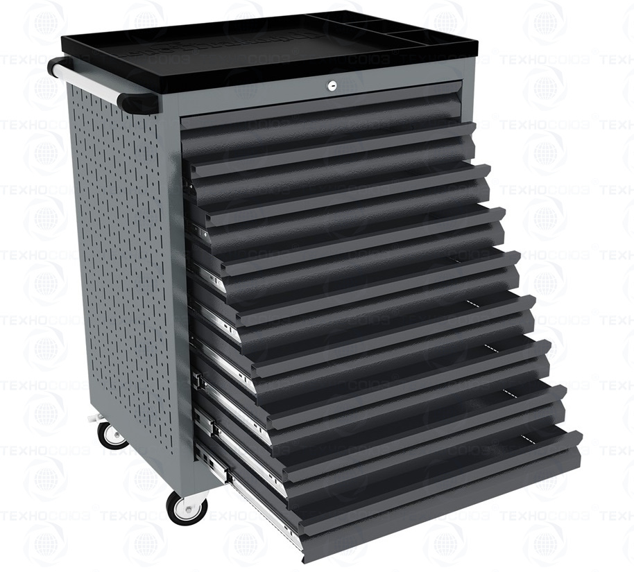 Тележки инструментальные серии PROFFI 950 предназначены для использования на предприятиях любого профиля занятых ремонтом и изготовлением различной продукции. На боковые стенки инструментальной тележки нанесена перфорация размером 25х25 мм и диаметром отверстия 8 мм, что позволяет устанавливать на них навесной инструмент или крючки. Наибольшей популярностью тележки инструментальные пользуются в сфере авторемонта и обслуживания автомобилей .Тележки имеют выдвижные ящики на шариковых телескопических направляющих полного выдвижения с фиксацией в закрытом положении, предотвращающее открывание при передвижении тележки. Ящики имеют центральный замок, который позволяет ограничить доступ посторонних лиц к содержимому ящиков. Тележка инструментальная изготовлена из высококачественного металла ведущих Российских производителей, покрашена порошковой краской производства Германии, имеет итальянскую и турецкую фурнитуру. Тележки для инструмента оснащены двумя не поворотными колесами диаметром 100 мм, одним поворотным и одним поворотным со стопором, которое фиксирует тележку и предотвращает непроизвольное скатывание.