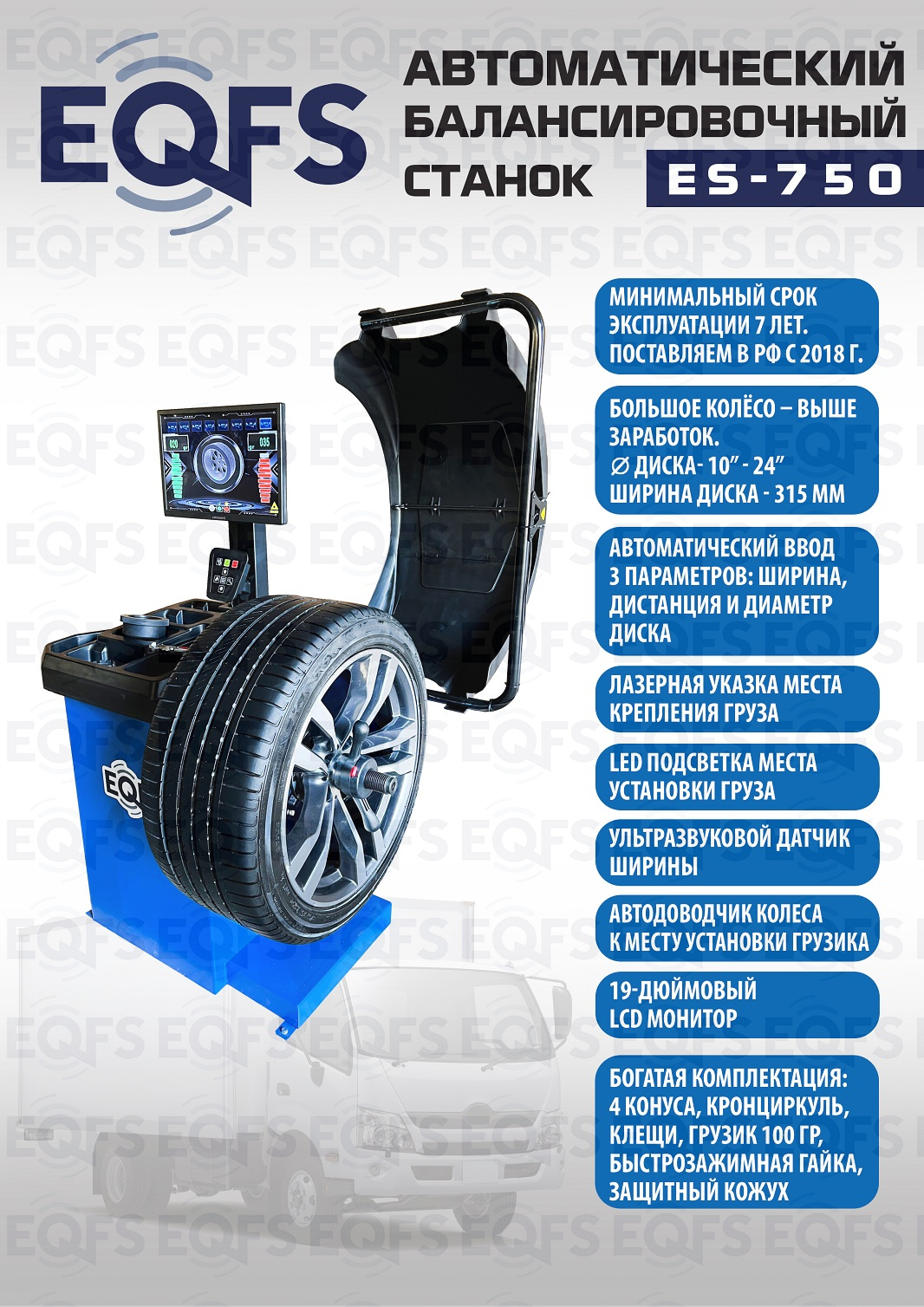 ES-750 Автоматический балансировочный станок. Автодоводчик и лазерная указка места установки грузика. Автоматический ввод 3-х параметров. Для колёс шириной 315мм, Ø до 800мм и весом до 65кг. Диски ширина 3–10” (76-254 мм) , диаметр 10–24” (254÷609 мм)   Программы: статическия и динамическая балансировка, ALU, OPT, SPLIT, калибровка и самодиагностика. LCD монитор 19 дюймов. Вал Ø - 40мм. Для балансировки колёс легковых автомобилей, мотоциклов, лёгких грузовиков и широких колёс. Гарантия 18 мес – наш монтаж, 12 мес – самостоятельная установка.
