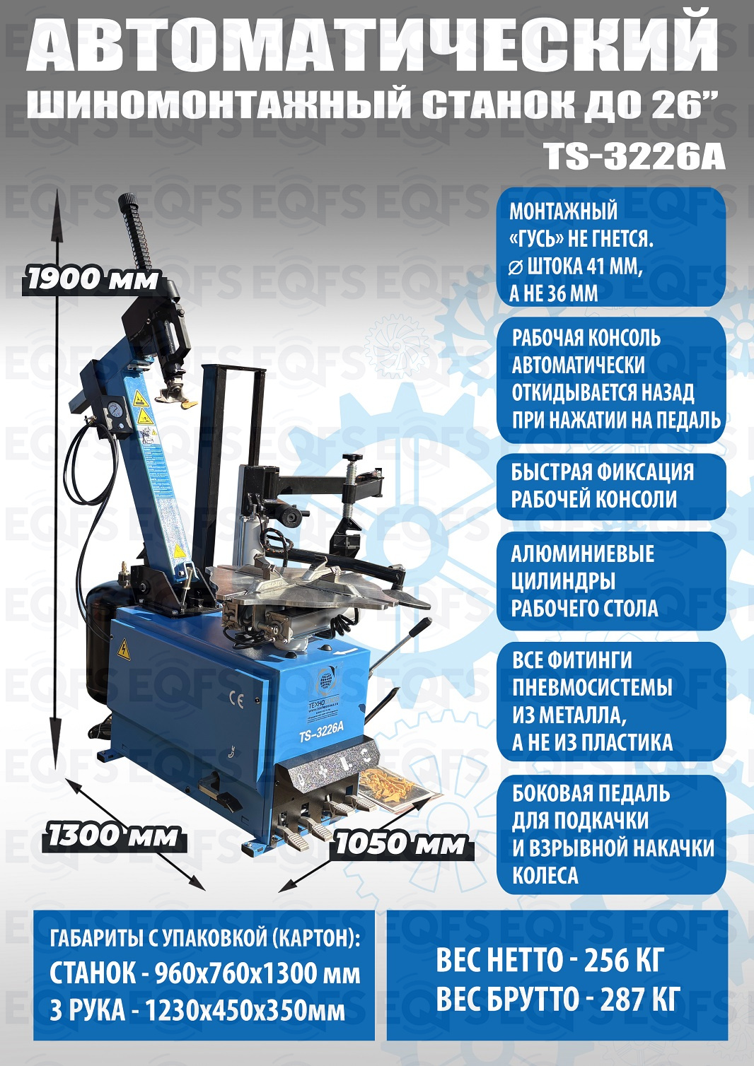 TS-3226A Станок шиномонтажный автоматический до 26". Для больших и широких колес. В комплекте бустер емкостью 24 литра (взрывная подкачка) + третья рука для работы с низкопрофильными шинами и RanFlat. Размеры дисков: снаружи 12÷24", изнутри 14÷26". Максимальное колесо: Ø 990x355 мм. 220/380В. Масса: 256 кг.