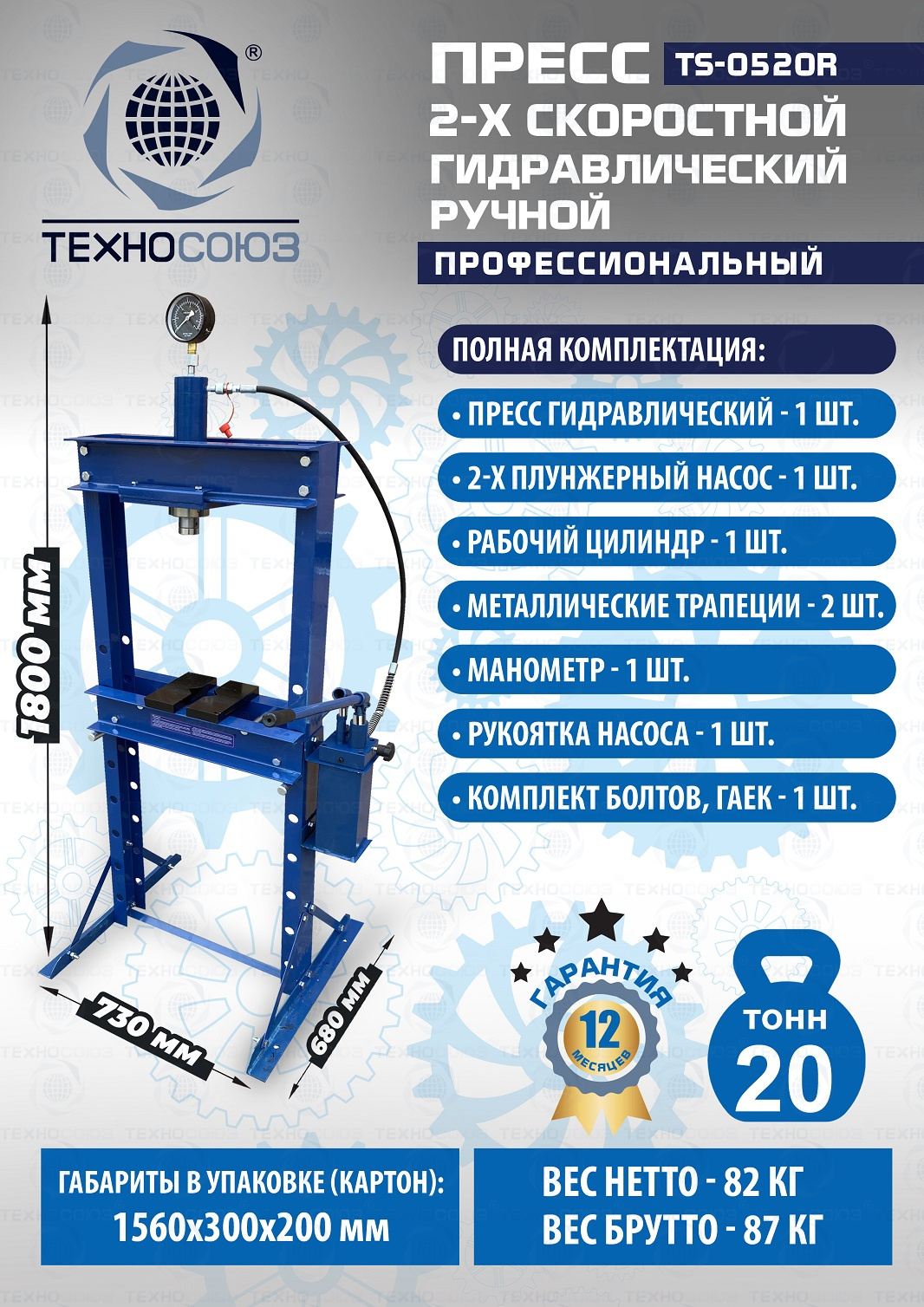 · Пресс укомплектован гидравлическим ручным насосом с максимальным усилием 20т.