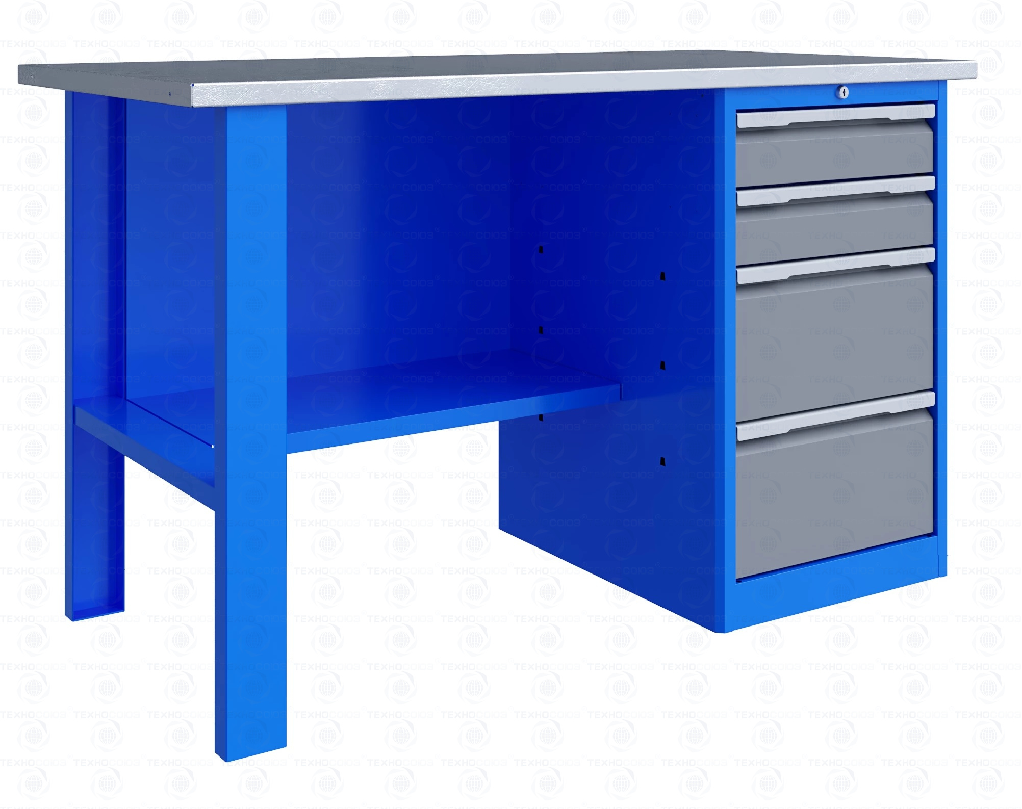 Однотумбовый. Допустимая нагрузка на столешницу 750 кг. Опорные элементы выполнены сварными из холоднокатаной стали. Верстак состоит из столешницы, опоры, тумбы P4 с двумя малыми и двумя большими ящиками и полки-стенки. Все металлические элементы покрыты полиэфирной порошковой краской. Столешница состоит из фанеры марки ФСФ толщиной 24 мм, которая покрыта лаком-антисептиком и листом оцинкованной холоднокатаной стали толщиной 1,2 мм. Размеры (ВхШхГ) 855x1396x696 мм.
