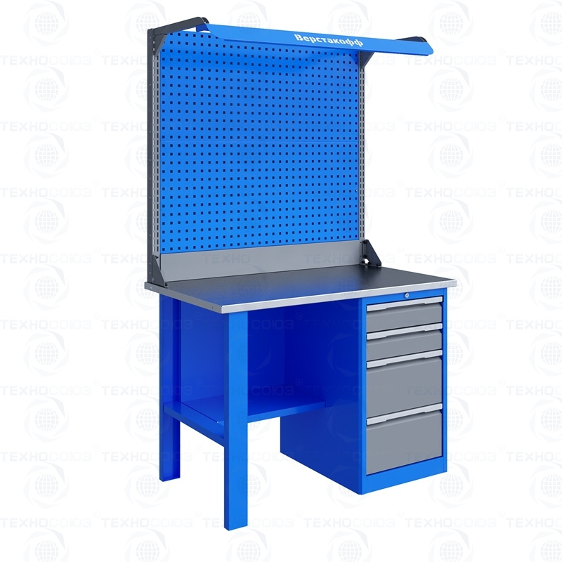 Однотумбовый. Допустимая нагрузка на столешницу 750 кг. Опорные элементы выполнены сварными из холоднокатаной стали. Для выполнения сборочных, ремонтных, слесарных, монтажных и других видов работ на производстве, в сервисных центрах, мастерских, гаражах, а также для обучения технологии в учебных заведениях. Комплектуется полкой-стенкой, расположенной под столешницей для удобного размещения габаритного инструмента и оснастки. Размеры верстака: 855x1196x696 мм. Вес: 73 кг. Поставляется в 4 комплектациях на выбор.